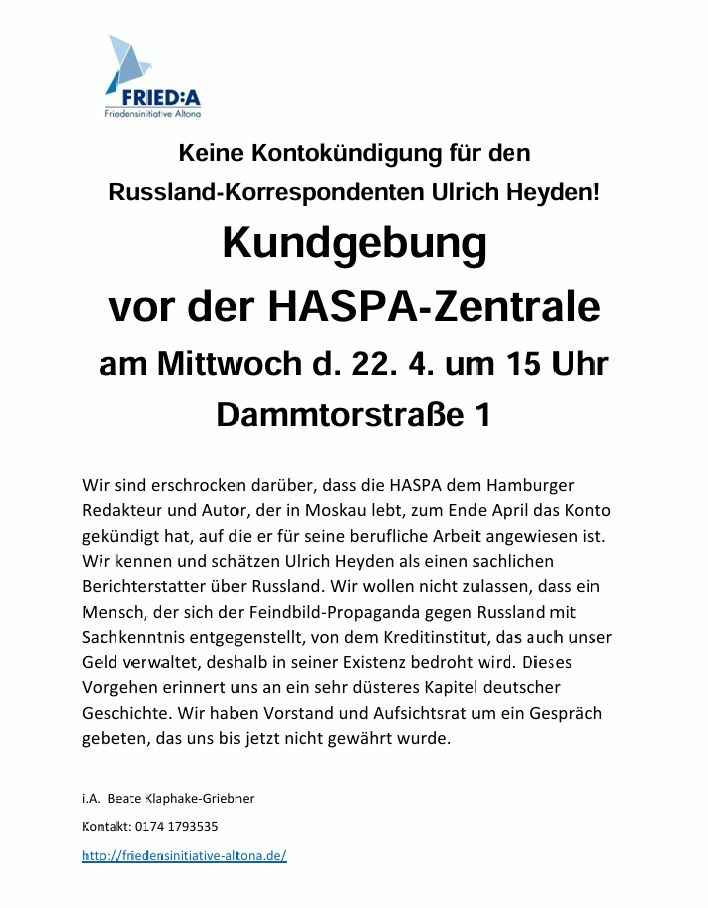 Die Hamburger Sparkasse hat dem Russland-Korrespondenten Ulrich Heyden das Konto gekündigt. Der Herausgeber der NachDenkSeiten Albrecht Müller hat über diesen Vorgang mit Ulrich Heyden gesprochen. Man spürt in dem hiermit veröffentlichten Video etwas von der langen und bitteren Erfahrung mit Aktionen und mit der Propaganda gegen ein gutes und friedliches Verhältnis zwischen unseren Völkern. Schon zu Beginn der Existenz der Bundesrepublik Deutschland West war das Verhältnis zur damaligen Sowjetunion und damit eng verknüpft die Propaganda gegen Russland und die Russen ein ergiebiges Thema für die innenpolitische Auseinandersetzung. Diese Pflege der Feindseligkeit hat die Verständigung von 1990, den Fall der Mauer und den Deutschland-Besuch des russischen Präsidenten Putin im Jahr 2001 überdauert. Die Feindseligkeit lebt und die Freundschaft leidet. Nicht zu fassen!