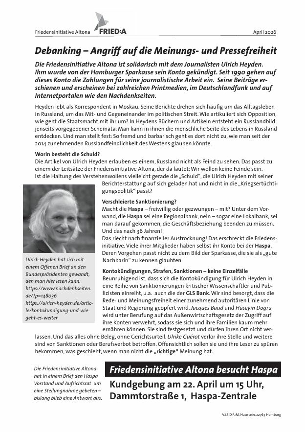 Die Hamburger Sparkasse hat dem Russland-Korrespondenten Ulrich Heyden das Konto gekündigt. Der Herausgeber der NachDenkSeiten Albrecht Müller hat über diesen Vorgang mit Ulrich Heyden gesprochen. Man spürt in dem hiermit veröffentlichten Video etwas von der langen und bitteren Erfahrung mit Aktionen und mit der Propaganda gegen ein gutes und friedliches Verhältnis zwischen unseren Völkern. Schon zu Beginn der Existenz der Bundesrepublik Deutschland West war das Verhältnis zur damaligen Sowjetunion und damit eng verknüpft die Propaganda gegen Russland und die Russen ein ergiebiges Thema für die innenpolitische Auseinandersetzung. Diese Pflege der Feindseligkeit hat die Verständigung von 1990, den Fall der Mauer und den Deutschland-Besuch des russischen Präsidenten Putin im Jahr 2001 überdauert. Die Feindseligkeit lebt und die Freundschaft leidet. Nicht zu fassen!